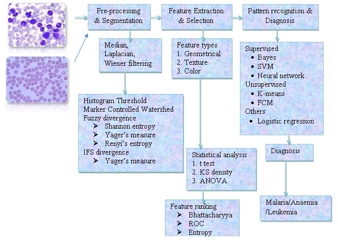 Pathological image processing is increasingly gaining importance for better characterization, visualization as well as disease recognition. Amongst various pathological tests of human being, microscopic evaluation of peripheral blood smears is very common and indispensable towards the characterization of pathological parameters. In the conventional practice, pathologists observe the abnormalities viz., parasitemia, anaemia, thalasaemia, leukemia, psoriasis etc based on the microscopic changes in terms of cellular morphology, texture and intensity of blood images. Usually this visual process of characterization and disease identification lead to complexities because of ambiguity. In order to improve the reliability of the decision by minimizing this uncertainty, the present work primarily focuses on the development of fuzzy set and intuitionistic fuzzy set theoretic approaches for segmentation, feature extraction and classification of light microscopic images of peripheral blood smears towards the detection of malaria, anaemia and leukemia. The total work is being depicted through the following schematic diagram.